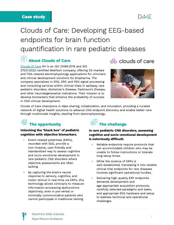 “Pediatric rare disease trials continue to face significant hurdles: high costs, long timelines, and endpoints that often lack the sensitivity to capture clinically meaningful change. DiMe’s initiative to define a core set of high-value digital measures is an important step toward more efficient, patient-centric, and evidence-driven development. At Clouds of Care, we were proud to contribute our expertise in neurophysiological measures, particularly EEG. We see EEG as a powerful and underutilized tool that goes beyond seizure counts to provide objective, quantifiable insights into brain function. Integrating these signals alongside other digital measures can improve endpoint sensitivity, reduce trial burden, and ultimately increase the probability of success in clinical development. Supporting initiatives like this closely aligns with our mission: advancing smarter, data-driven approaches that make clinical research more meaningful for patients and more effective for sponsors.”
