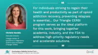 “For individuals striving to regain their health and productivity as part of opioid addiction recovery, preventing relapses is essential… Our Triangle CERSI program serves as the ideal platform for this work, bringing together academia, industry, and the FDA to address high-priority regulatory needs and accelerate solutions.”